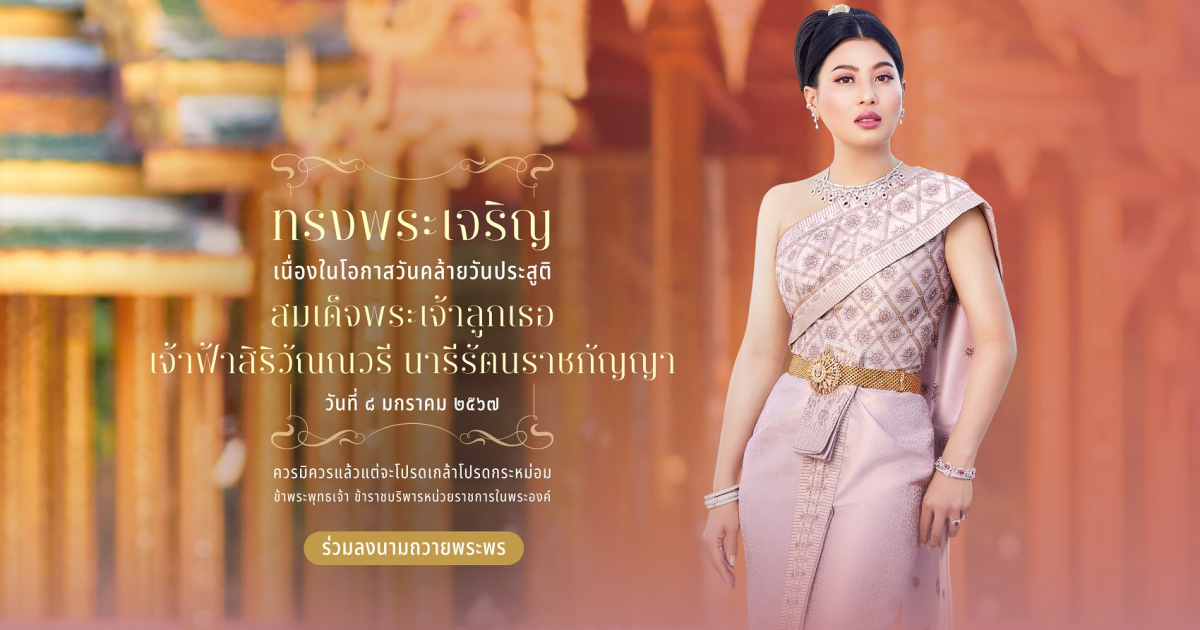 ขอเชิญชวนประชาชน ร่วมลงนามถวายพระพร 9 มกราคม 2567 โดย admpunpin / ข่าวประชาสัมพันธ์ ขอเชิญชวนประชาชน ร่วมลงนามถวายพระพร สมเด็จพระเจ้าลูกเธอ เจ้าฟ้าสิริวัณณวรี นารีรัตนราชกัญญา เนื่องในโอกาสวันคล https://wellwishes.royaloffice.th/index.php/home/index/32 Facebook iconFacebookTwitter iconTwitterLINE iconLine