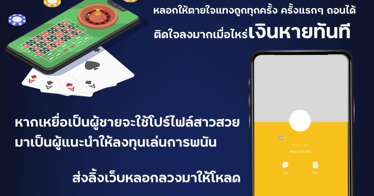 ●สร้างโปรไฟล์สาวสวยไปสุ่มทักไลน์ผู้ชาย ชักชวนหารายได้พิเศษ โดยจะให้ลิ้งคุยกับอีก 1 คน ที่มีความชำนาญในการชักชวนลงทุนเกี่ยวกับการพนัน รับประกันว่ามีรายได้แน่นอน