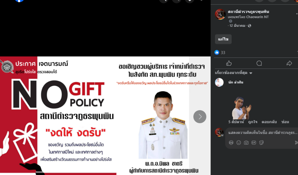 เมื่อวันที่ 4 มีนาคม พ.ศ.2568 พ.ต.อ.นิพล ชาตรี ผู้กำกับการสถานีตำรวจภูธรพุนพิน ได้มีการสั่งการให้เจ้าหน้าที่ จัดทำอินโฟกราฟิค ประชาสัมพันธ์ นโยบายต่อต้านการรับสินบน (Anti-Bribery Policy) และการไม่รับของขวัญของกำนัลหรือประโยชน์อื่นใด (No Gift Policy) จากการปฏิบัติหน้าที่