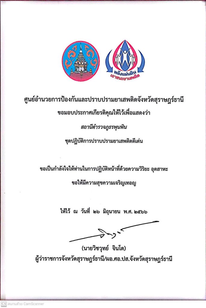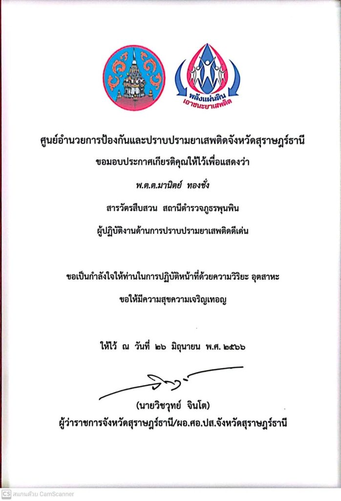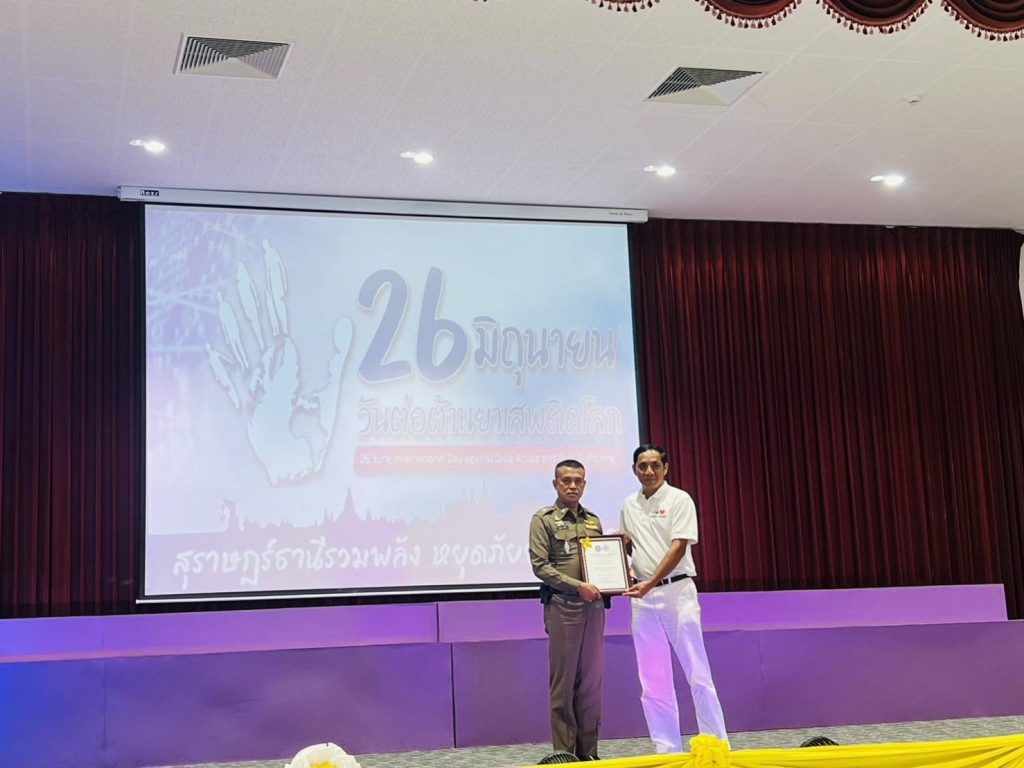 เมื่อวันที่ 26 มิ.ย.66 ศอ.ปส.จังหวัดสุราษฎร์ธานีได้มอบมอบประกาศเกียรติคุณ ให้แก่