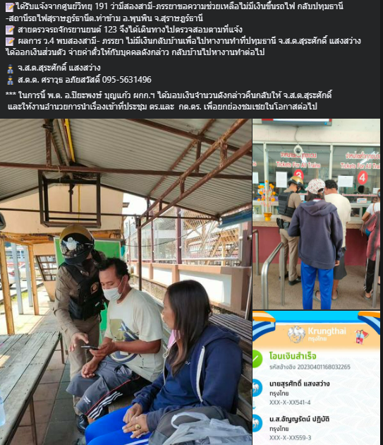 📝ได้รับแจ้งจากศูนย์วิทยุ 191 ว่ามีสองสามี-ภรรยาขอความช่วยเหลือไม่มีเงินขึ้นรถไฟ กลับปทุมธานี