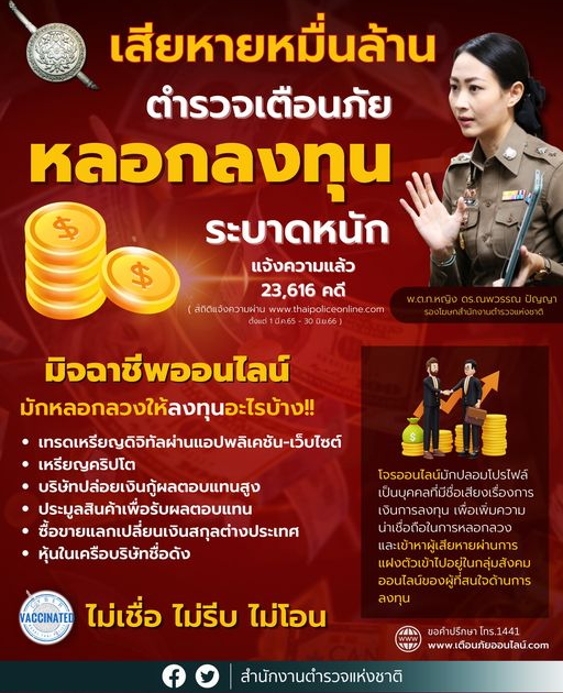 พ.ต.ท.หญิง ณพวรรณฯ เปิดเผยสถิติคดีออนไลน์ที่ประชาชนแจ้งความผ่านระบบออนไลน์ที่เว็บไซต์ www.thaipoliceonline.com AKUN PRO KAMBOJA โดยคดีหลอกให้ลงทุนผ่านระบบคอมพิวเตอร์ ตั้งแต่ 1 มี.ค.65 – 30 มิ.ย.66 มีการแจ้งความจำนวนสูงถึง 23,616 คดี ยอดความเสียหายรวมสูงกว่า 11,550 ล้านบาท สำหรับเดือนมิถุนายนที่ผ่านมา มียอดการแจ้งความสูงถึง 876 คดี ยอดความเสียหายรวมสูงกว่า 600 ล้านบาท