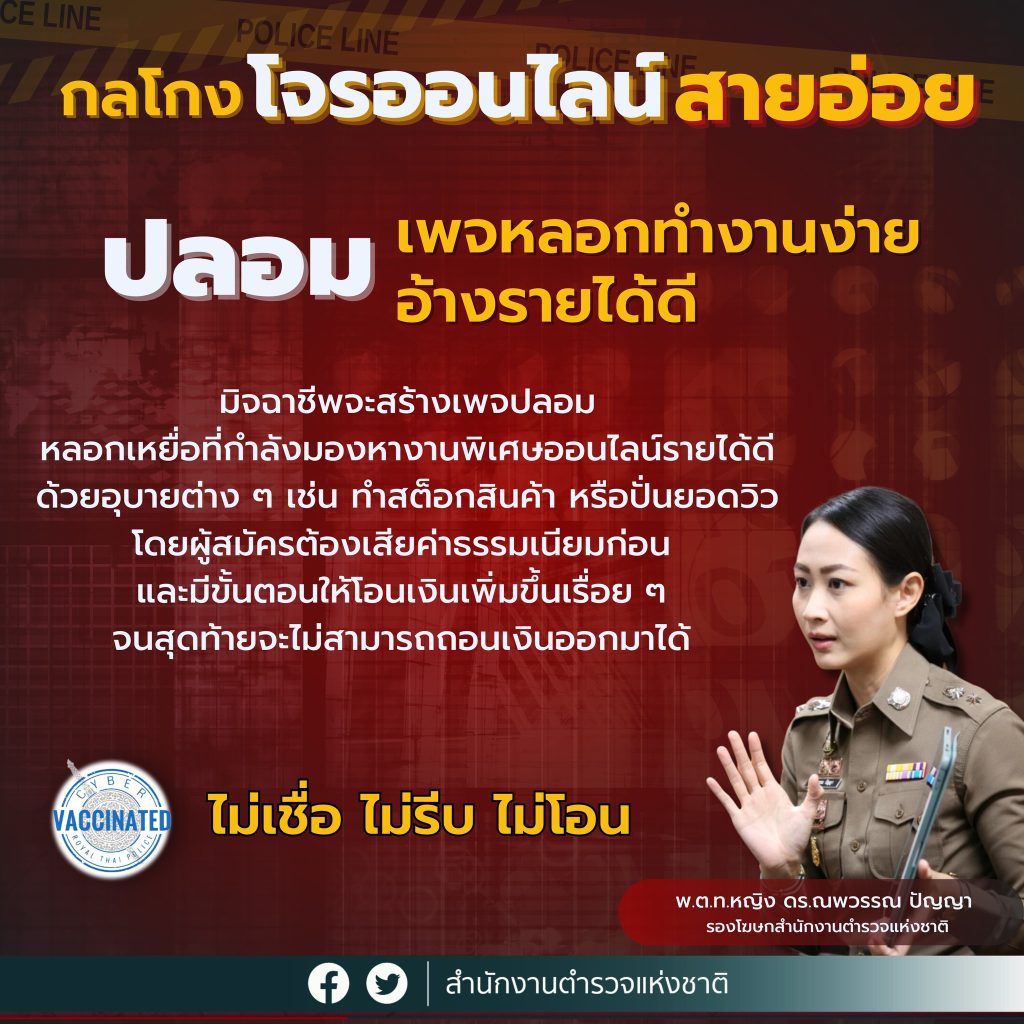 3. “ปลอมเพจหลอกทำงานง่ายรายได้ดี” มิจฉาชีพจะสร้างเพจปลอมหลอกเหยื่อที่กำลังมองหางานพิเศษออนไลน์รายได้ดีด้วยอุบายต่างๆ เช่น ทำสต็อกสินค้า หรือปั่นยอดวิว โดยผู้สมัครต้องเสียค่าธรรมเนียมก่อน และมีขั้นตอนให้โอนเงินเพิ่มขึ้นเรื่อยๆ จนสุดท้ายจะไม่สามารถถอนเงินออกมาได้