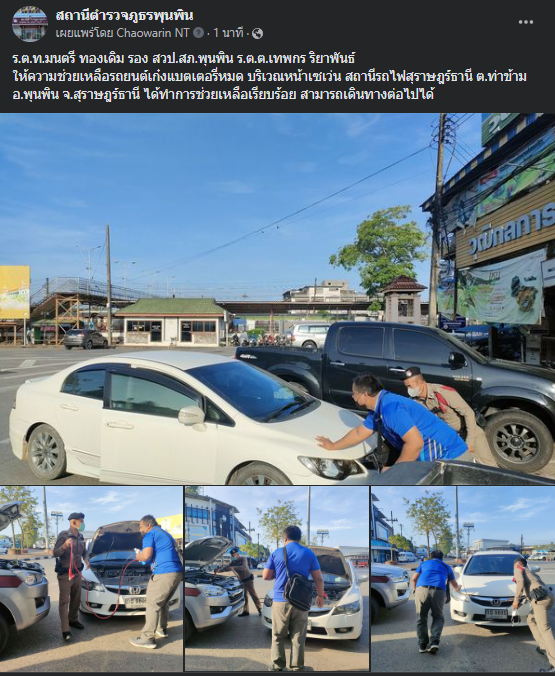 ร.ต.ท.มนตรี ทองเดิม รอง สวป.สภ.พุนพิน ร.ต.ต.เทพกร ริยาพันธ์ให้ความช่วยเหลือรถยนต์เก๋งแบตเตอรี่หมด บริเวณหน้าเซเว่น สถานีรถไฟสุราษฎร์ธานี ต.ท่าข้าม อ.พุนพิน จ.สุราษฎร์ธานี ได้ทำการช่วยเหลือเรียบร้อย สามารถเดินทางต่อไปได้