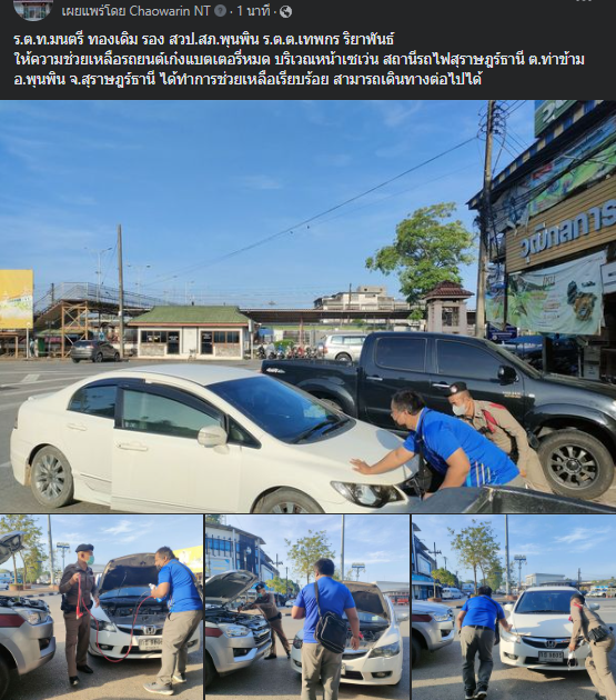 ร.ต.ท.มนตรี ทองเดิม รอง สวป.สภ.พุนพิน ร.ต.ต.เทพกร ริยาพันธ์ให้ความช่วยเหลือรถยนต์เก๋งแบตเตอรี่หมด บริเวณหน้าเซเว่น สถานีรถไฟสุราษฎร์ธานี ต.ท่าข้าม อ.พุนพิน จ.สุราษฎร์ธานี ได้ทำการช่วยเหลือเรียบร้อย สามารถเดินทางต่อไปได้