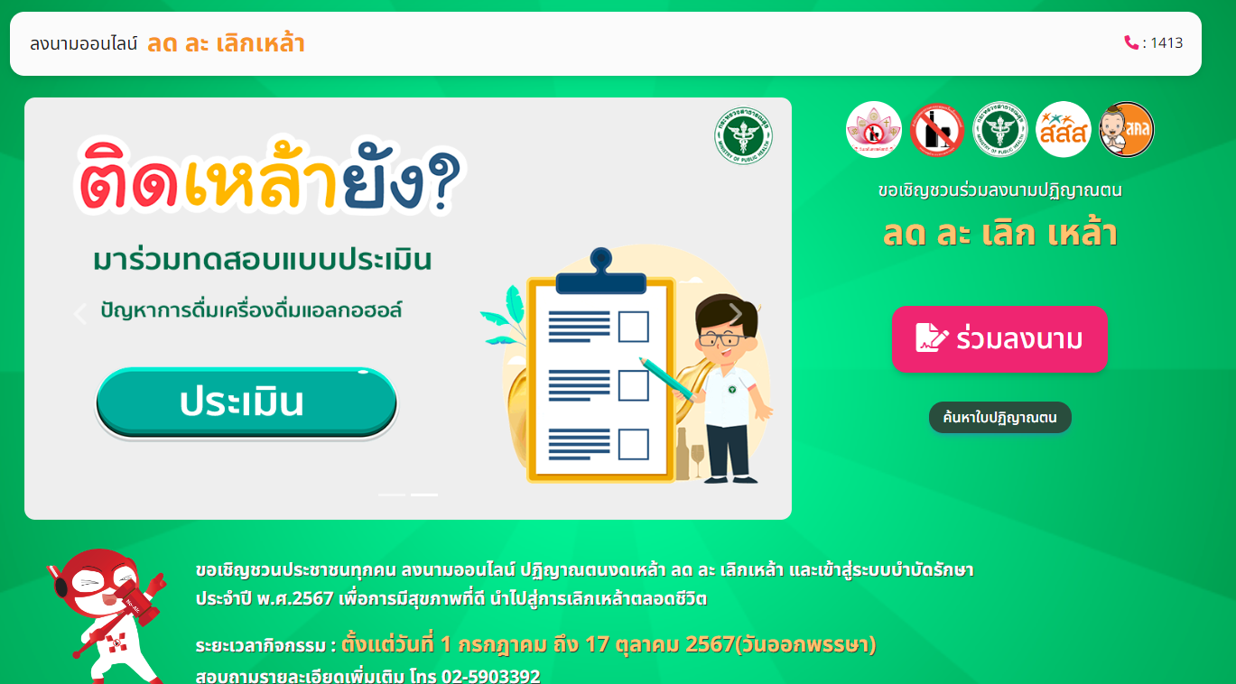 ขอเชิญชวนประชาชนทุกคน ลงนามออนไลน์ ปฏิญาณตนงดเหล้า ลด ละ เลิกเหล้า และเข้าสู่ระบบบำบัดรักษาประจำปี พ