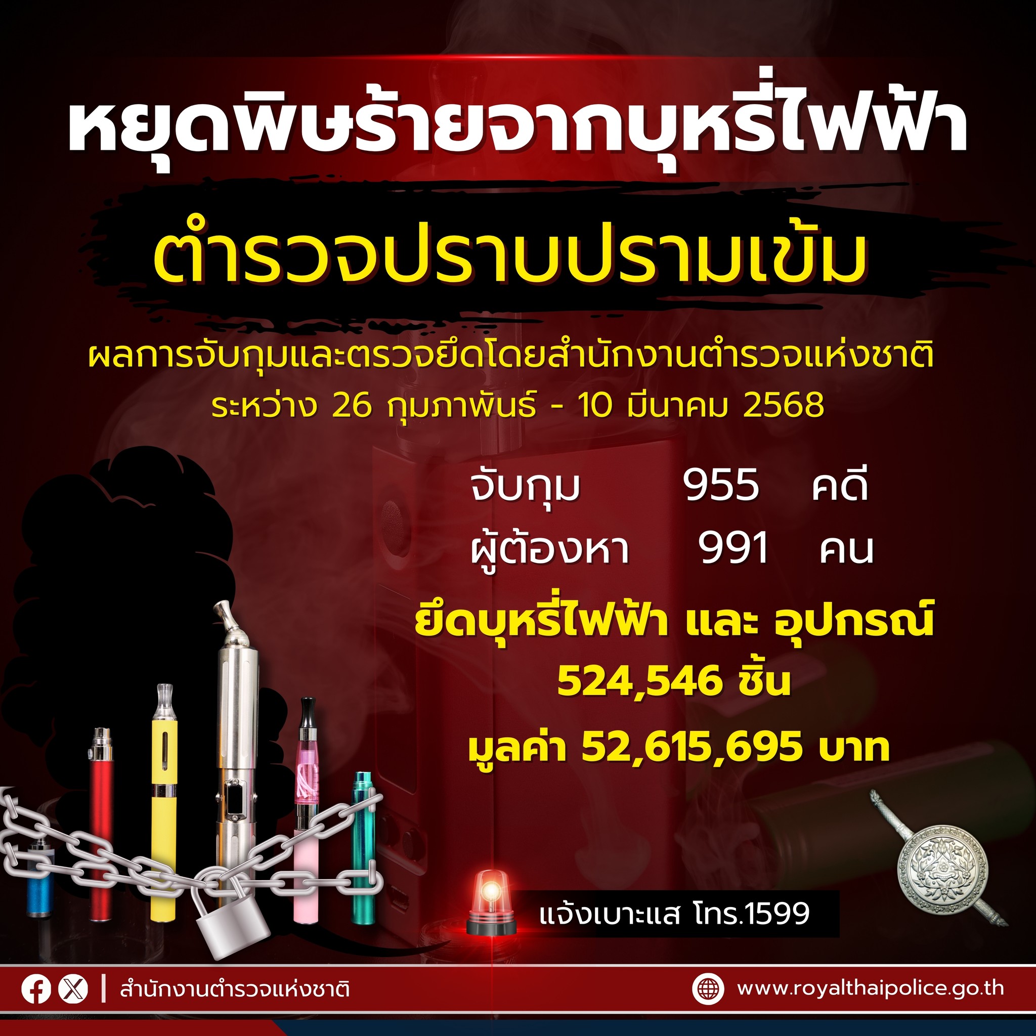 สำนักงานตำรวจแห่งชาติปราบปรามเข้ม จับกุมตรวจยึดอย่างต่อเนื่อง กว่า 2 สัปดาห์ ยึดบุหรี่ไฟฟ้าและอุปกรณ