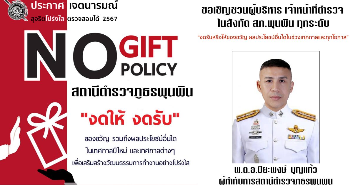 สถานีตำรวจภูธรพุนพิน ประกาศเจตนารมณ์ No Gift Policy ชอเชิญชวนผู้บริหาร เจ้าหน้าที่ตำรวจ ในสังกัด สภ.พุนพิน ทุกระดับ งดรับหรือให้ของขวัญ ผลประโยชน์อื่นใดในช่วงเทศกาล หรือทุกโอกาส